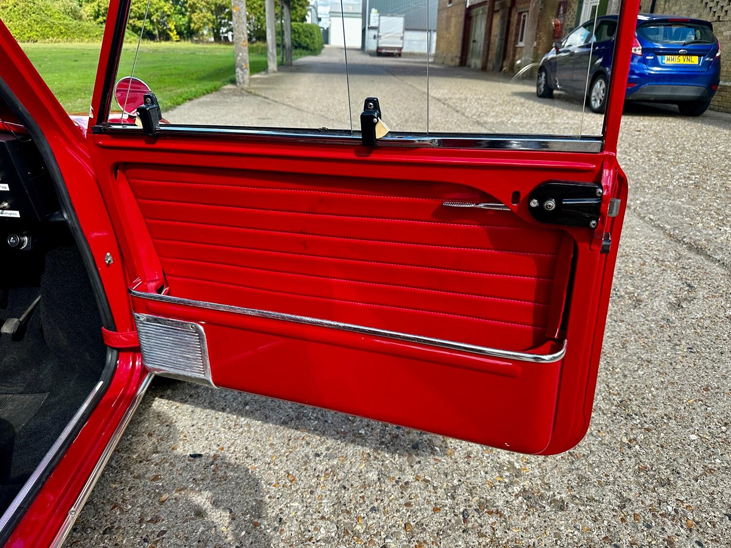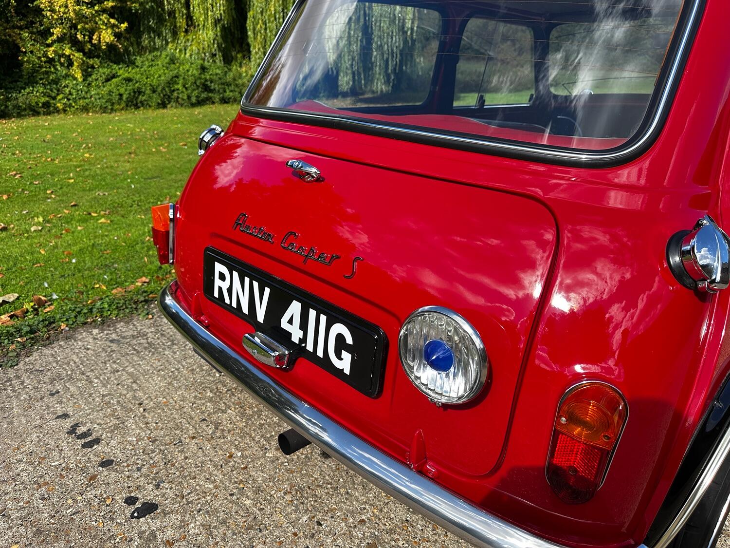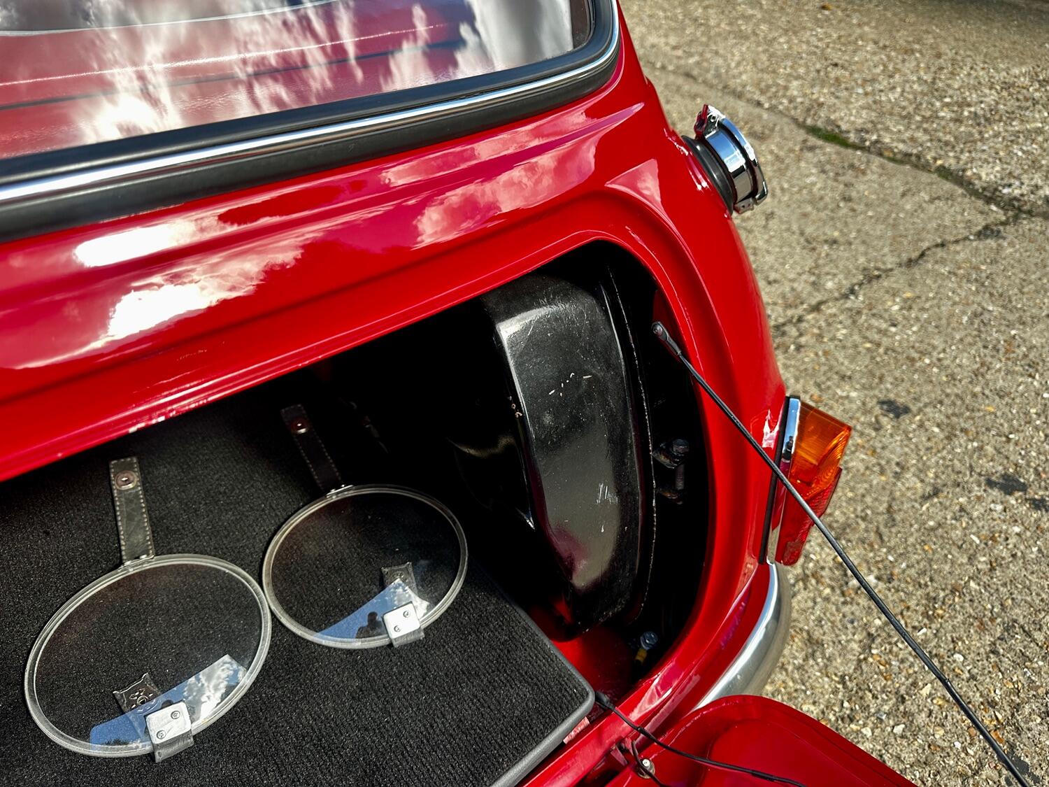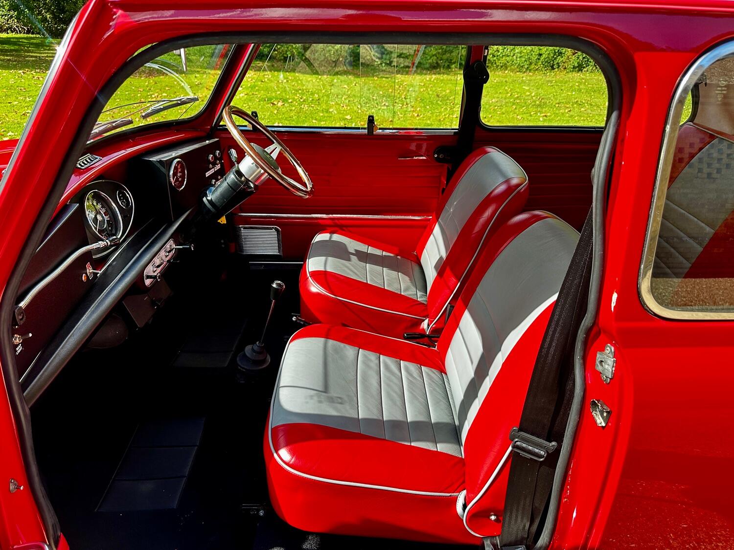 Having collected the car from long term garage storage, we have since undertaken a careful programme of recommissioning the car including fuel drain, new brake master cylinder, service and a fresh motor test in preparation for sale. We understand that the mechanical specification was done faithful to Cooper S standards with a 1275cc 1300GT based engine complete with 11-stud head, twin 1¼” SU carburettors, Maniflow LCB manifold, twin fuel tank set up and Mini-Sport exhaust system. The braking system is handled by the correct 7½” Cooper S discs while the suspension has been rebuilt on new subframes and retains the desirable dry set-up.