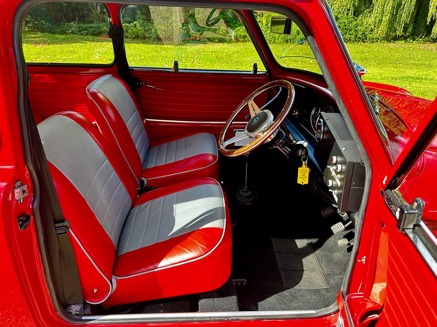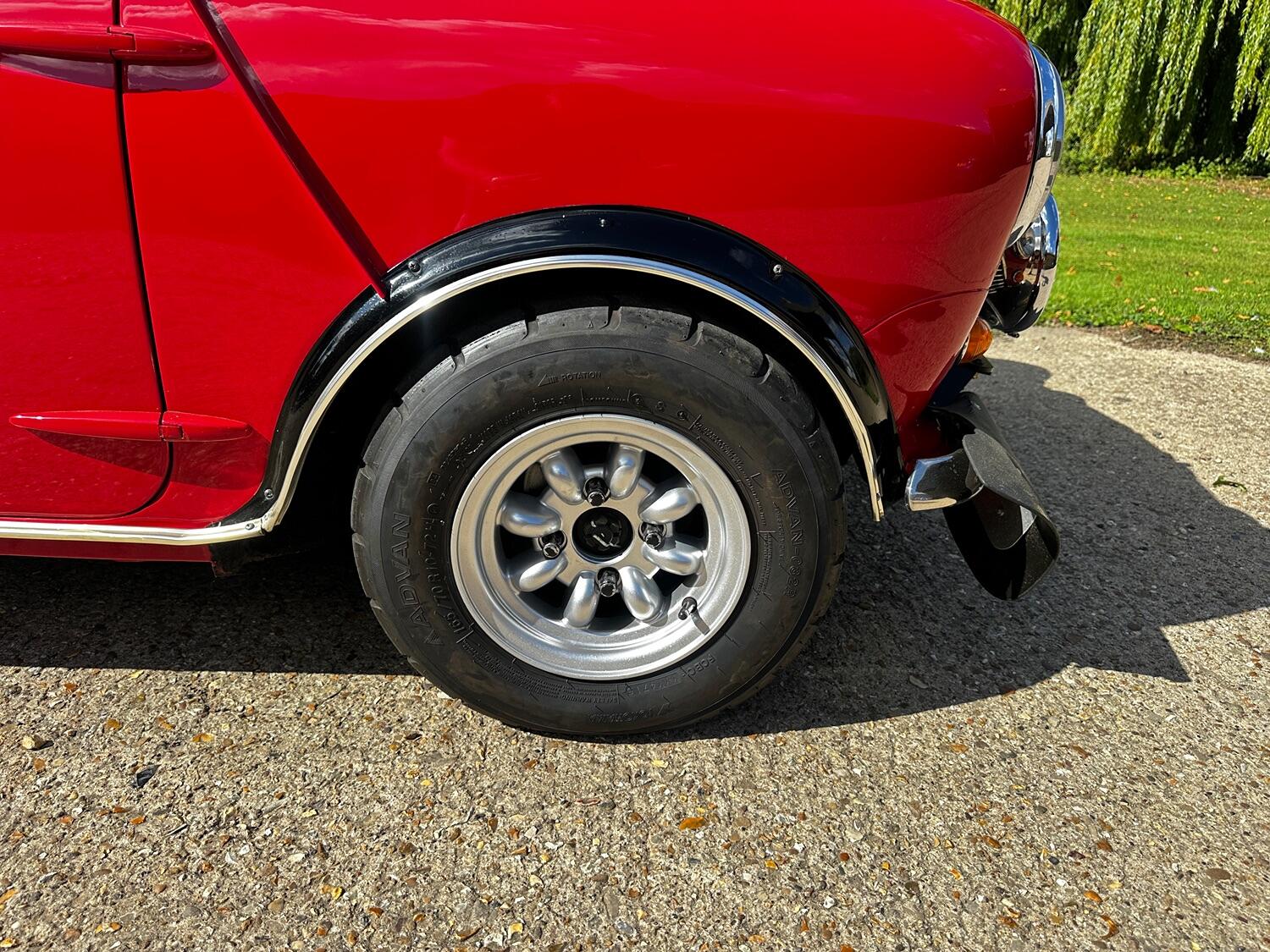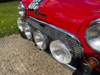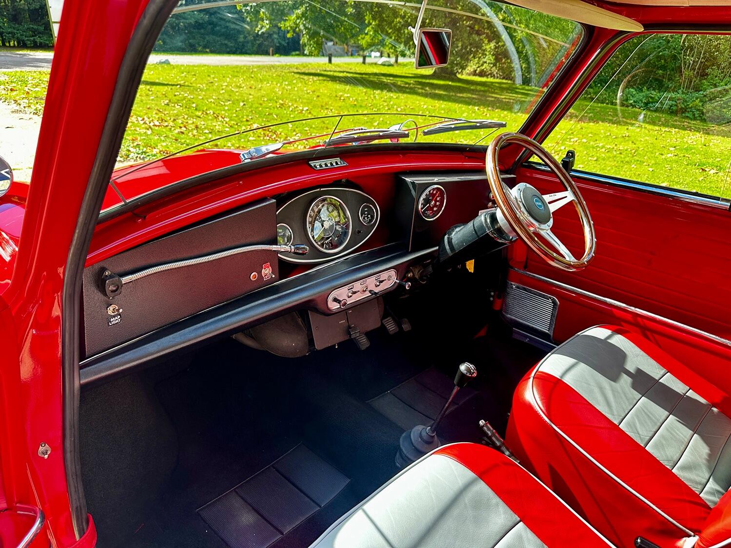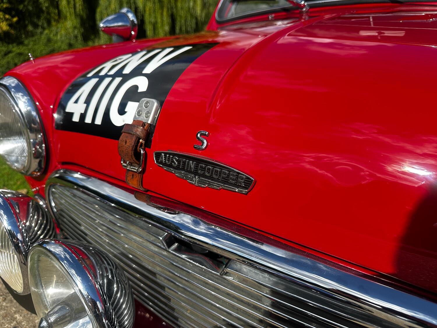 Visually the exterior of the car is difficult to distinguish from the original car with period correct detailing such as the badges, bonnet strap, removable front grille, bullet style mirrors, white door number panels, front mud flaps, quad light set up and original style headlamp protectors. Internally the cabin is now trimmed in Red and Grey leather and features period Cooper S details including correct door cards, instruments, fittings and race preparation style dash. To complete the overall look of the car it is fitted with Cooper reverse-rim wheels which perfectly finish off its purposeful stance.
