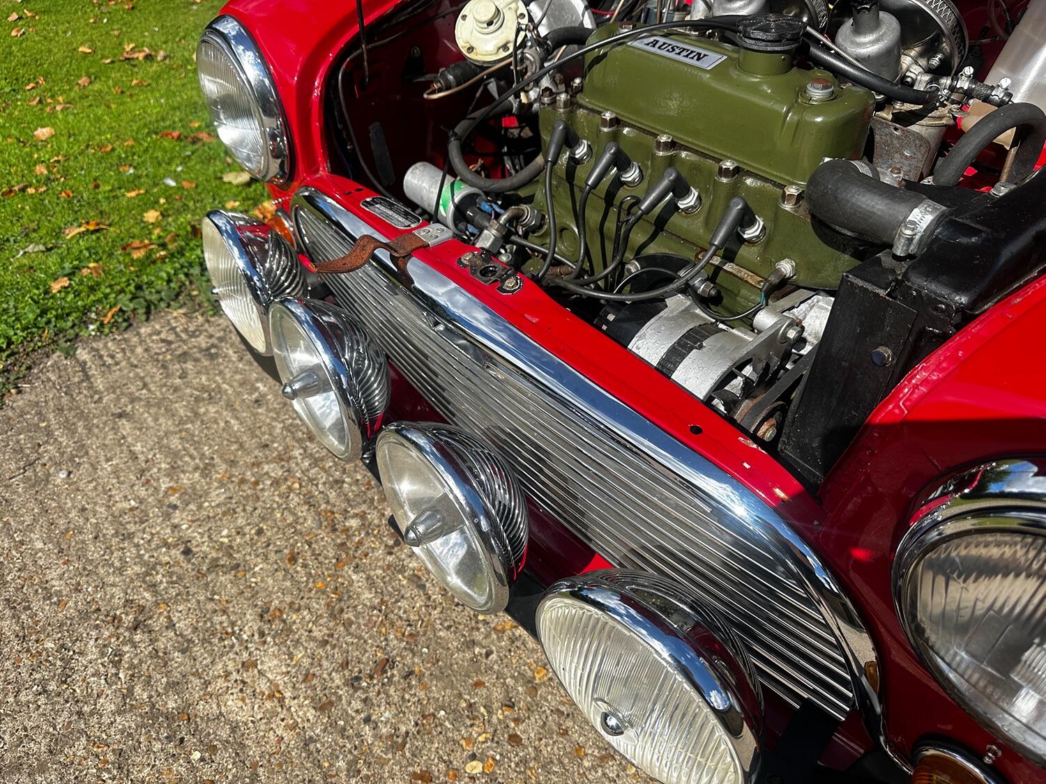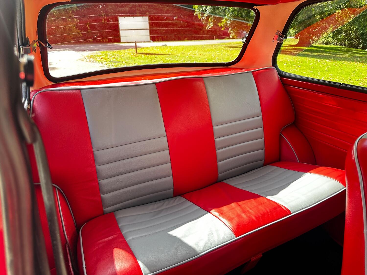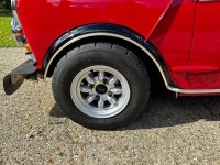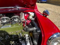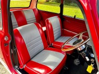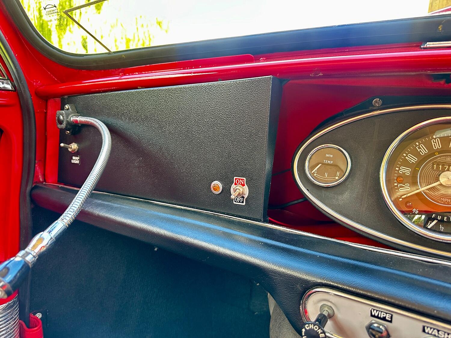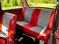 Visually the exterior of the car is difficult to distinguish from the original car with period correct detailing such as the badges, bonnet strap, removable front grille, bullet style mirrors, white door number panels, front mud flaps, quad light set up and original style headlamp protectors. Internally the cabin is now trimmed in Red and Grey leather and features period Cooper S details including correct door cards, instruments, fittings and race preparation style dash. To complete the overall look of the car it is fitted with Cooper reverse-rim wheels which perfectly finish off its purposeful stance.