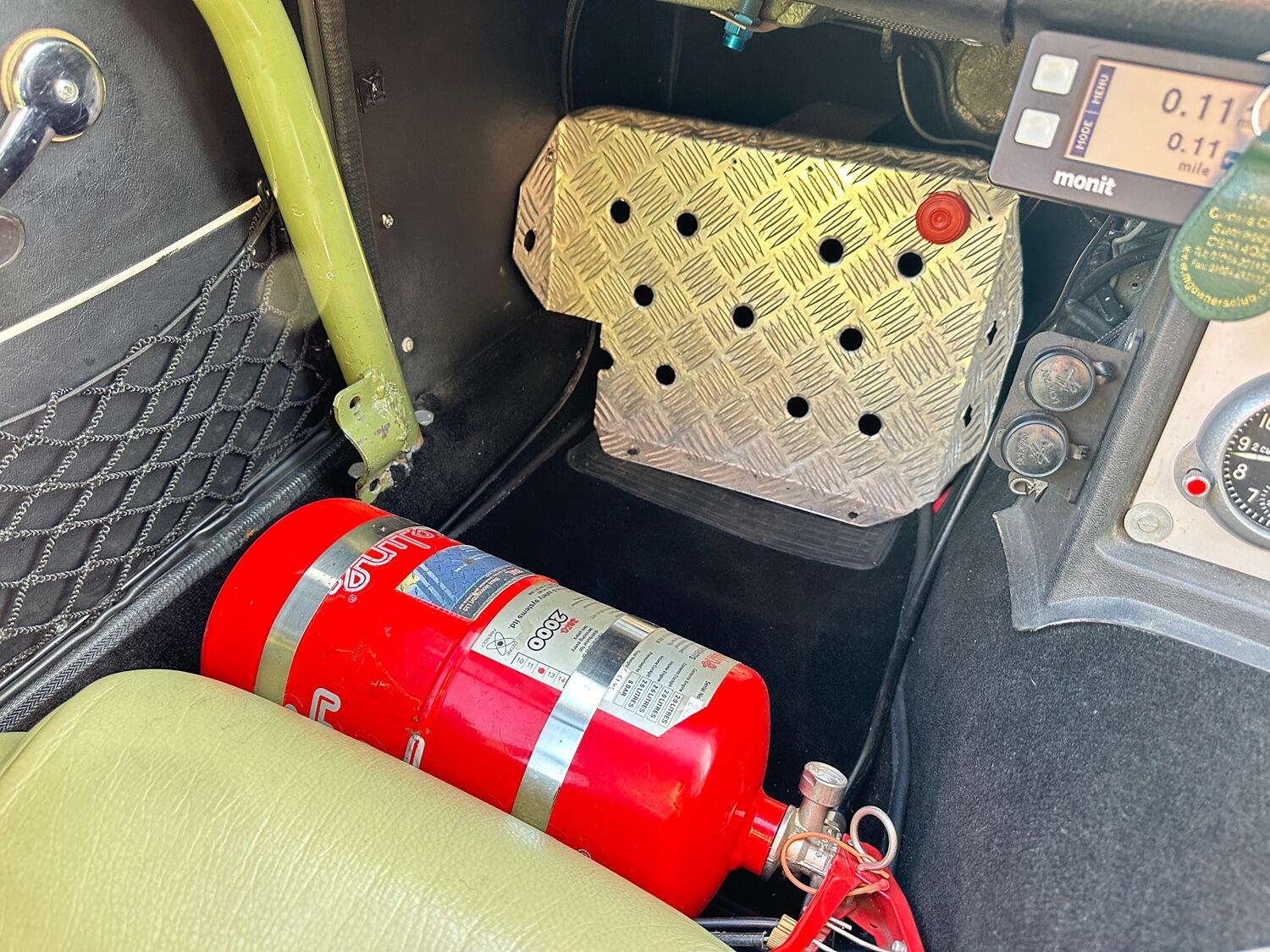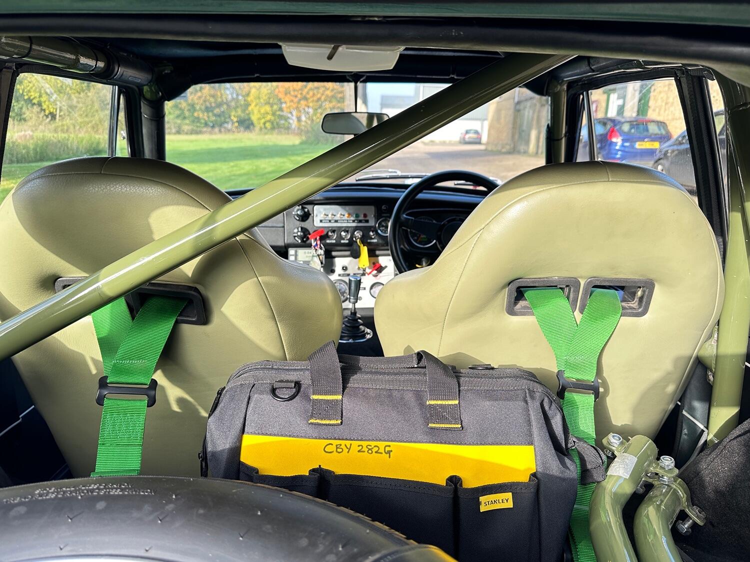 The braking system is upgraded to rally specifications including a new master cylinder, callipers, discs, and brake lines. Suspension upgrades include MG Motorsport torsion bars, a high-ratio rack and pinion steering setup, new engine and gearbox mounts, and Spax adjustable shock absorbers. Underneath, the car is equipped for all-terrain reliability rallying, with full protection including guards for the exhaust, sump, and critical undercarriage components. Inside, safety features include a rally ignition cut-off, fire extinguisher system and a monitoring meter to assist with navigation.