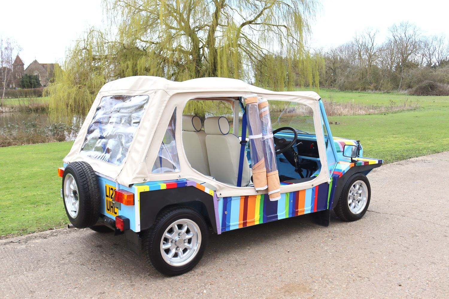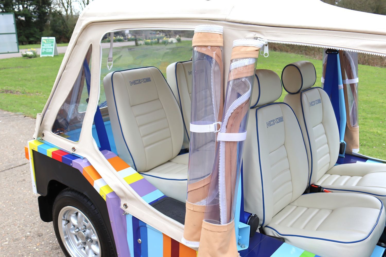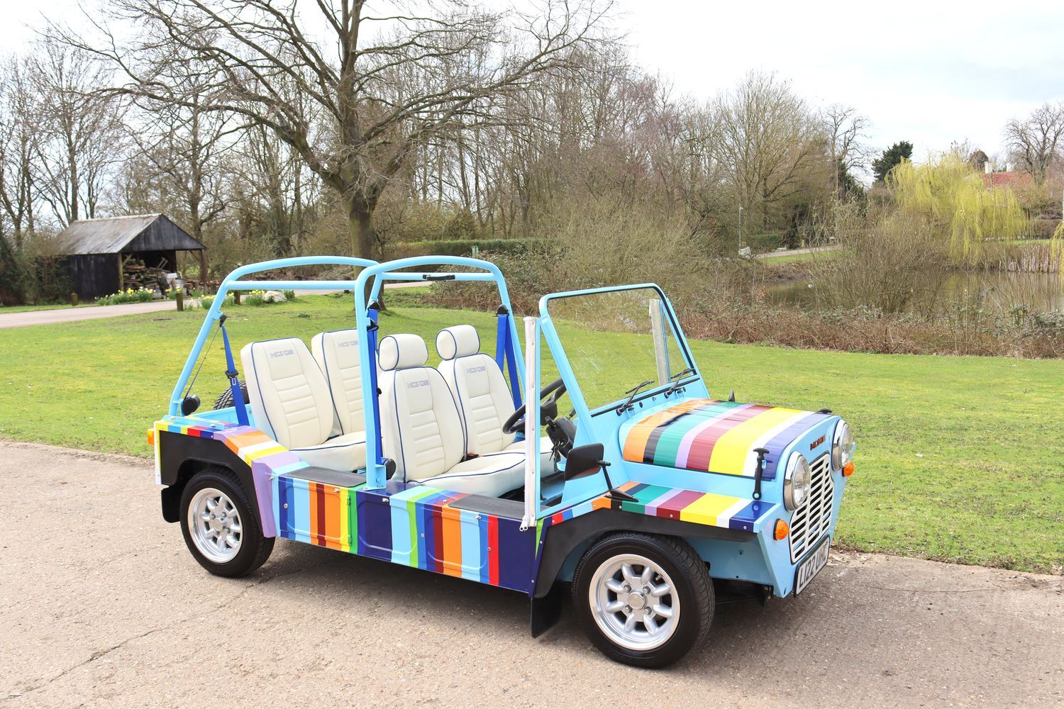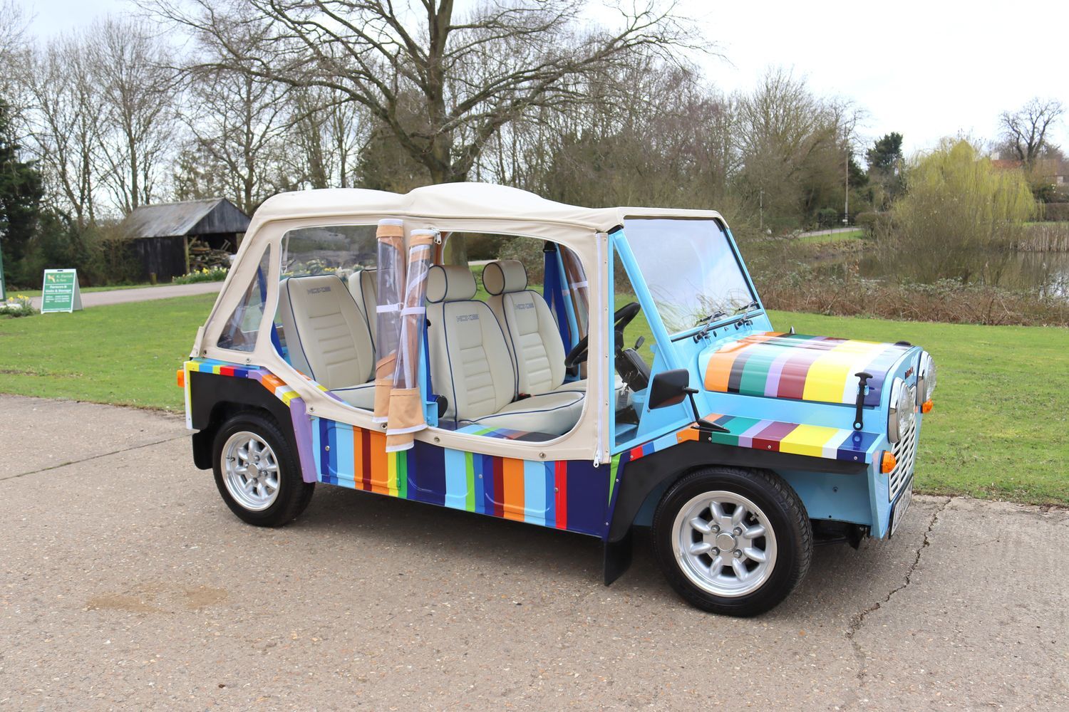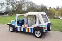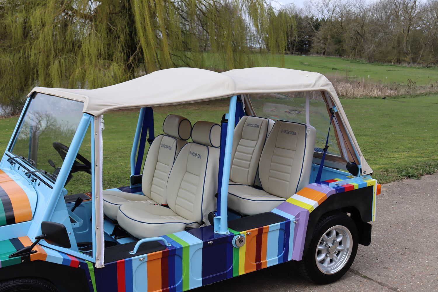 Just arrived at RJH Cars we have this absolute stunner of a 1993 Mini Moke that has been fully restored and now sporting the Paul Smith Colours. This Moke was originally supplied new to Manila where it was used for tourists on the island. The car was shipped back to the UK around five years ago where its previous owner commissioned the car to be totally restored and replicated as a Paul Smith vision of the Moke as you see it today. Primarily it was built for use at his holiday home during the summer which is when a car like as this comes into its own. All 4 seats are fitted with inertia seat belts making it great fun to use not only as an adults car but secure for the kids to come along too. This very fine example is in outstanding condition and has the later seats, polished alloy wheels and the benefit of total wet weather equipment.