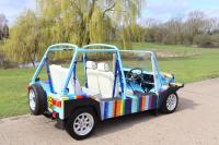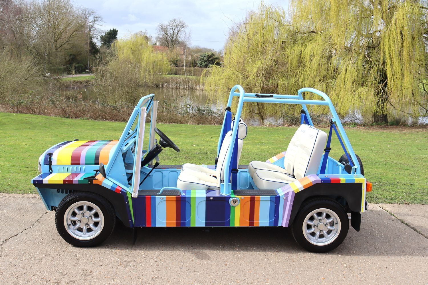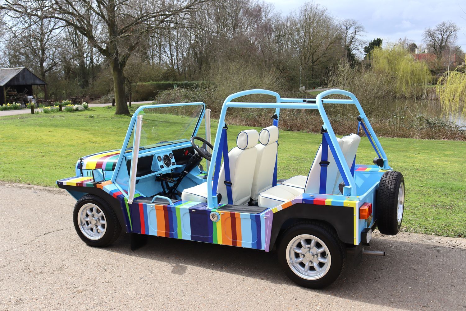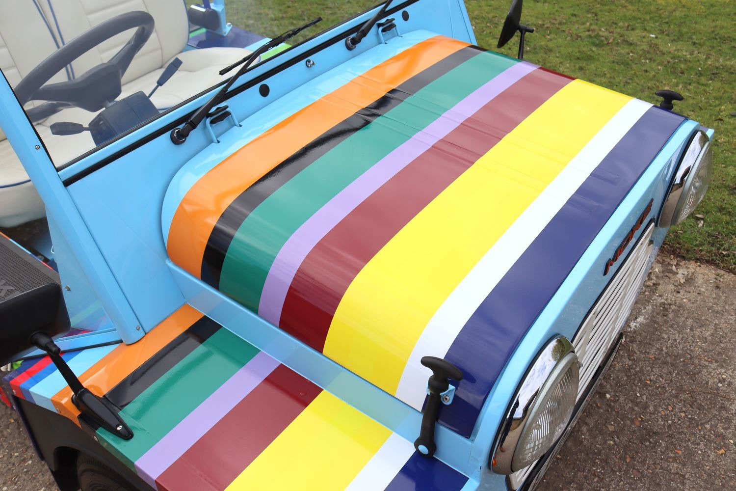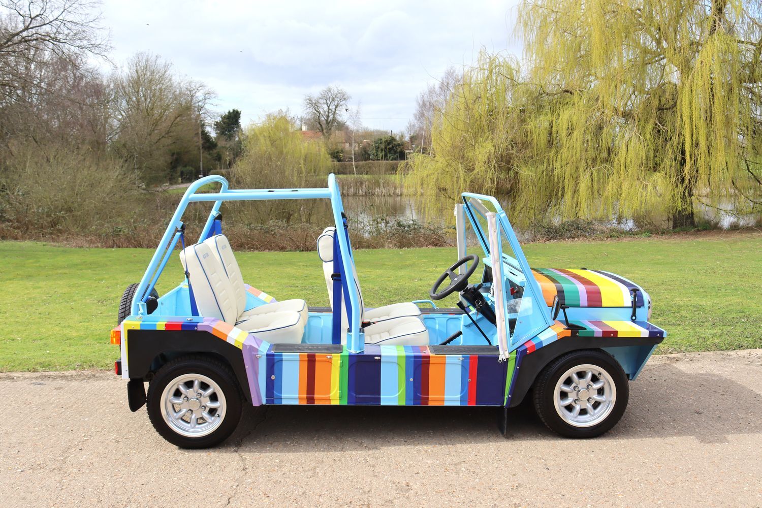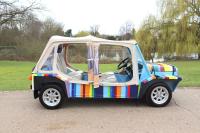 Just arrived at RJH Cars we have this absolute stunner of a 1993 Mini Moke that has been fully restored and now sporting the Paul Smith Colours. This Moke was originally supplied new to Manila where it was used for tourists on the island. The car was shipped back to the UK around five years ago where its previous owner commissioned the car to be totally restored and replicated as a Paul Smith vision of the Moke as you see it today. Primarily it was built for use at his holiday home during the summer which is when a car like as this comes into its own. All 4 seats are fitted with inertia seat belts making it great fun to use not only as an adults car but secure for the kids to come along too. This very fine example is in outstanding condition and has the later seats, polished alloy wheels and the benefit of total wet weather equipment.