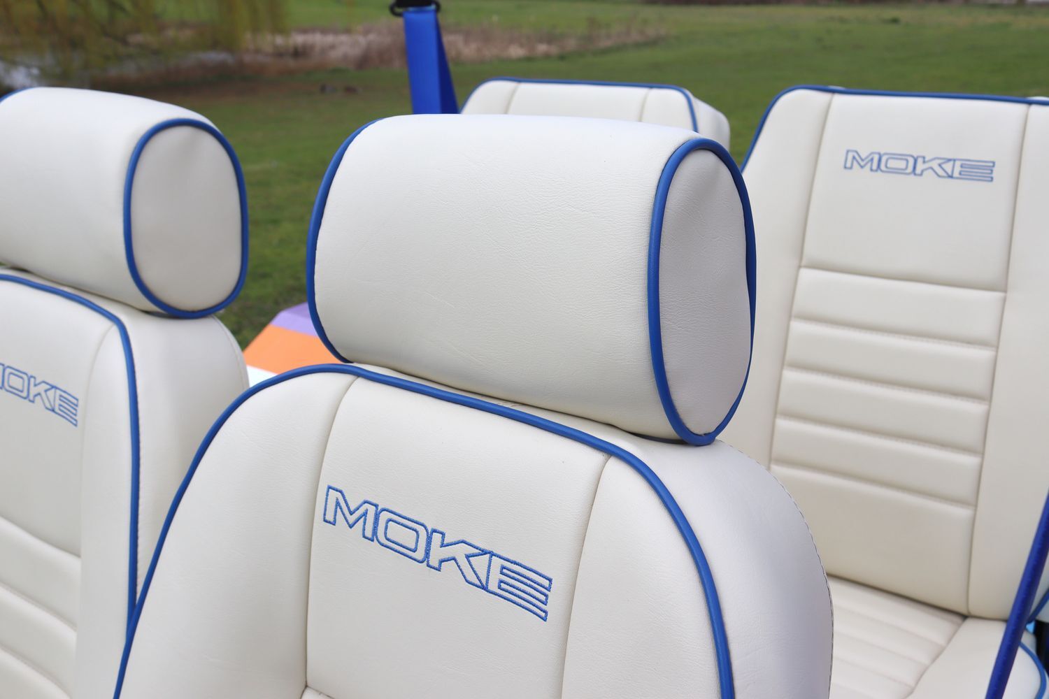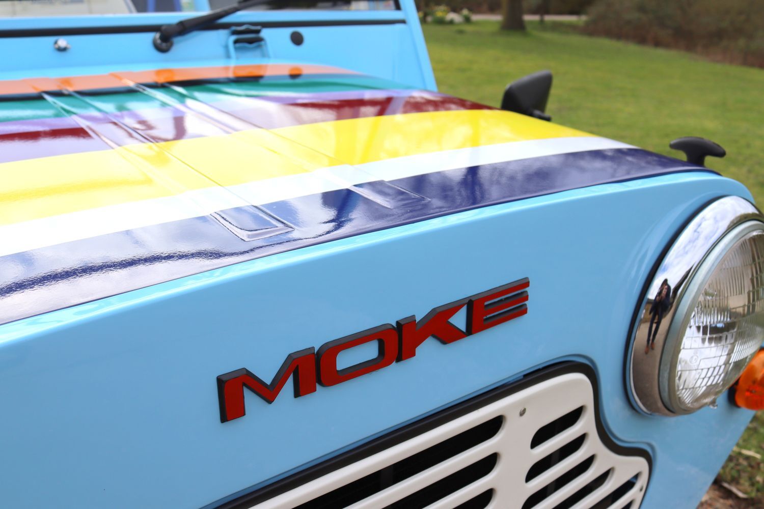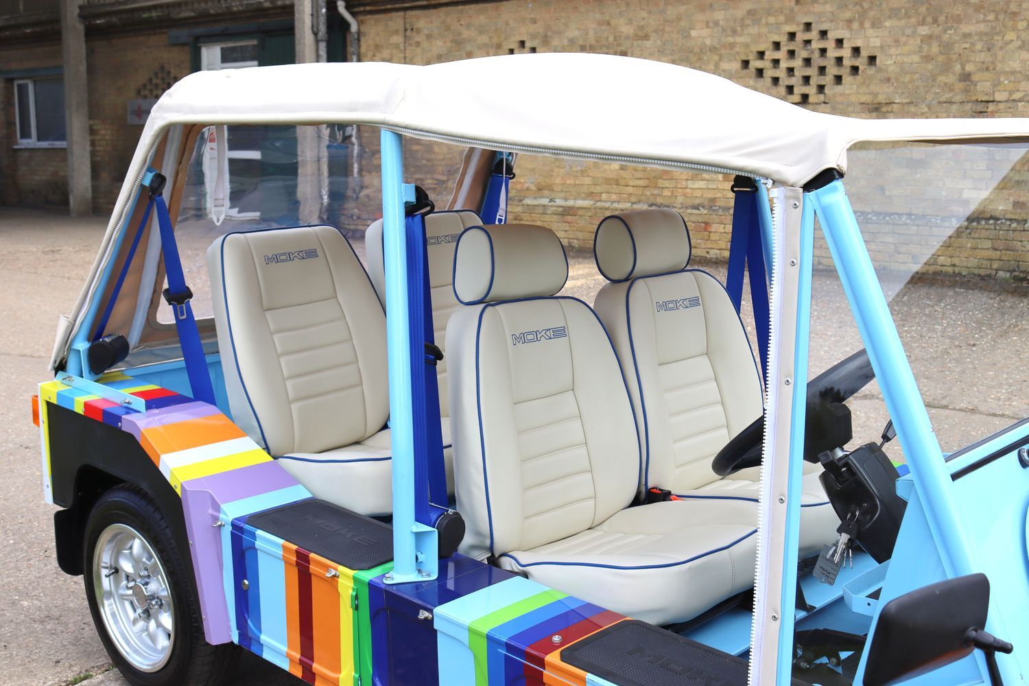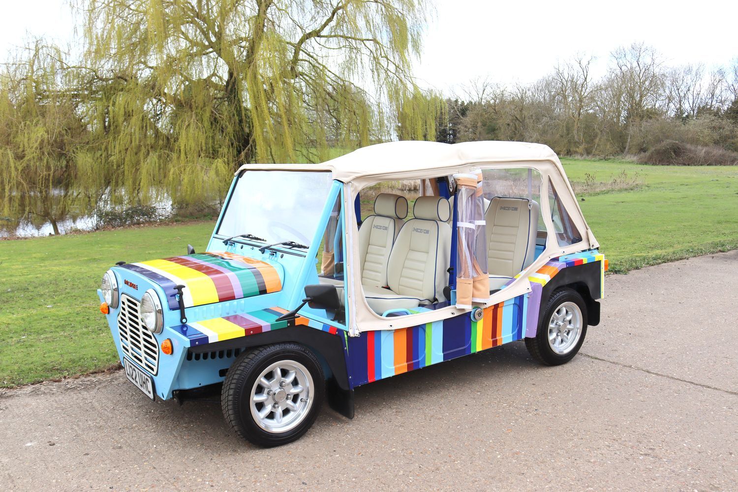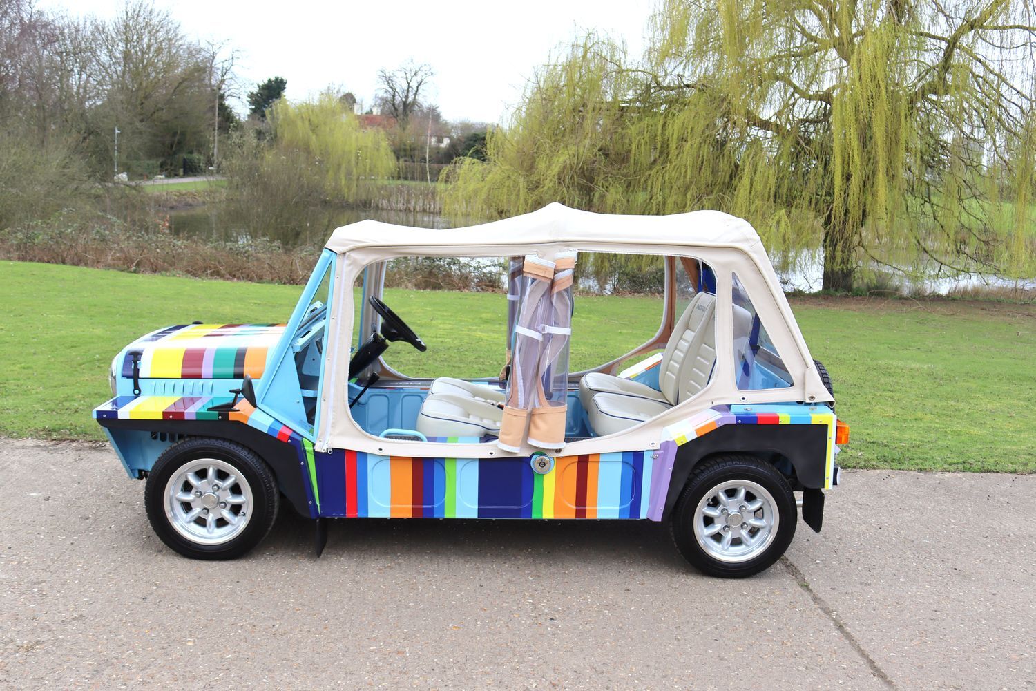 Just arrived at RJH Cars we have this absolute stunner of a 1993 Mini Moke that has been fully restored and now sporting the Paul Smith Colours. This Moke was originally supplied new to Manila where it was used for tourists on the island. The car was shipped back to the UK around five years ago where its previous owner commissioned the car to be totally restored and replicated as a Paul Smith vision of the Moke as you see it today. Primarily it was built for use at his holiday home during the summer which is when a car like as this comes into its own. All 4 seats are fitted with inertia seat belts making it great fun to use not only as an adults car but secure for the kids to come along too. This very fine example is in outstanding condition and has the later seats, polished alloy wheels and the benefit of total wet weather equipment.
