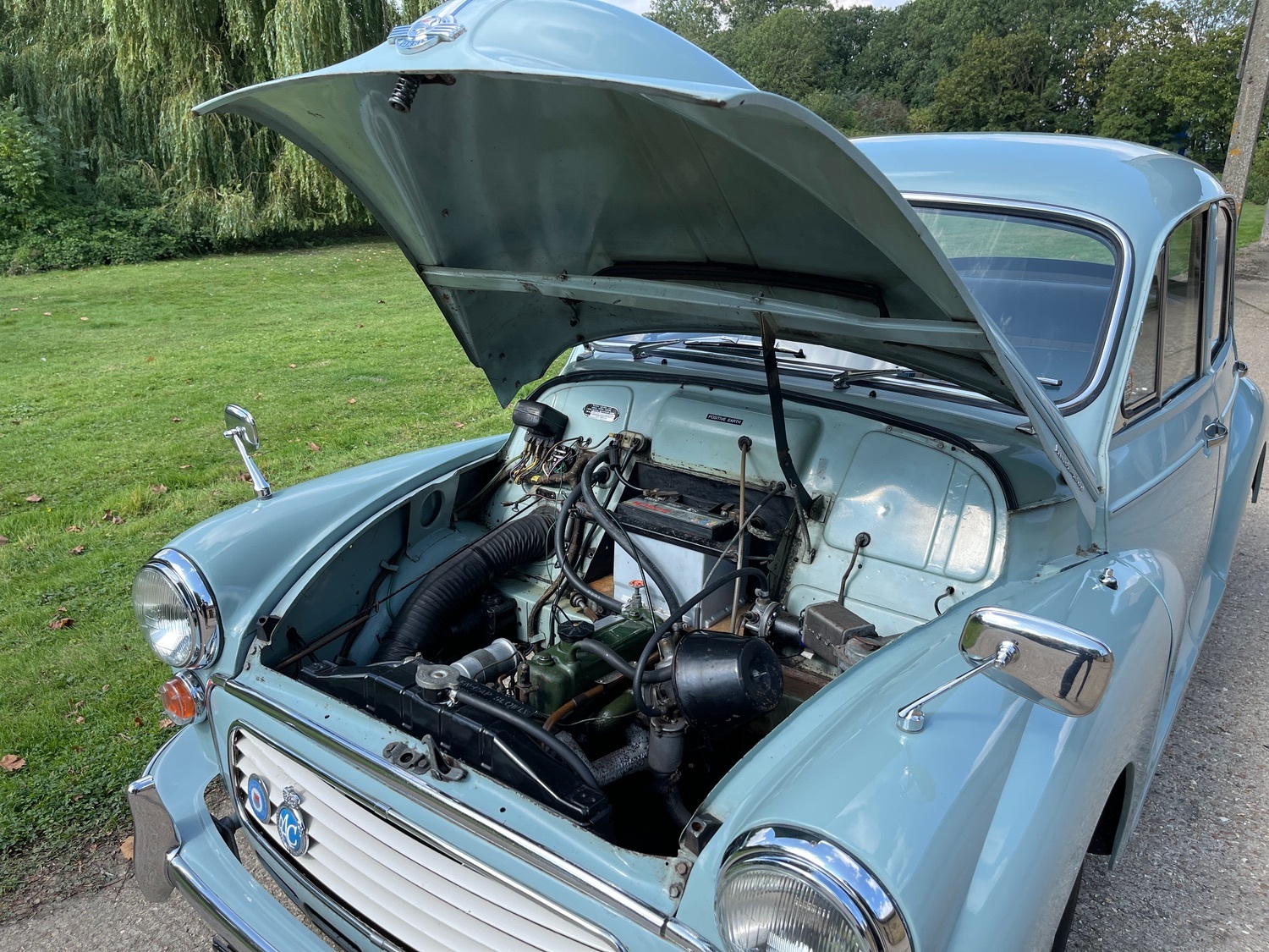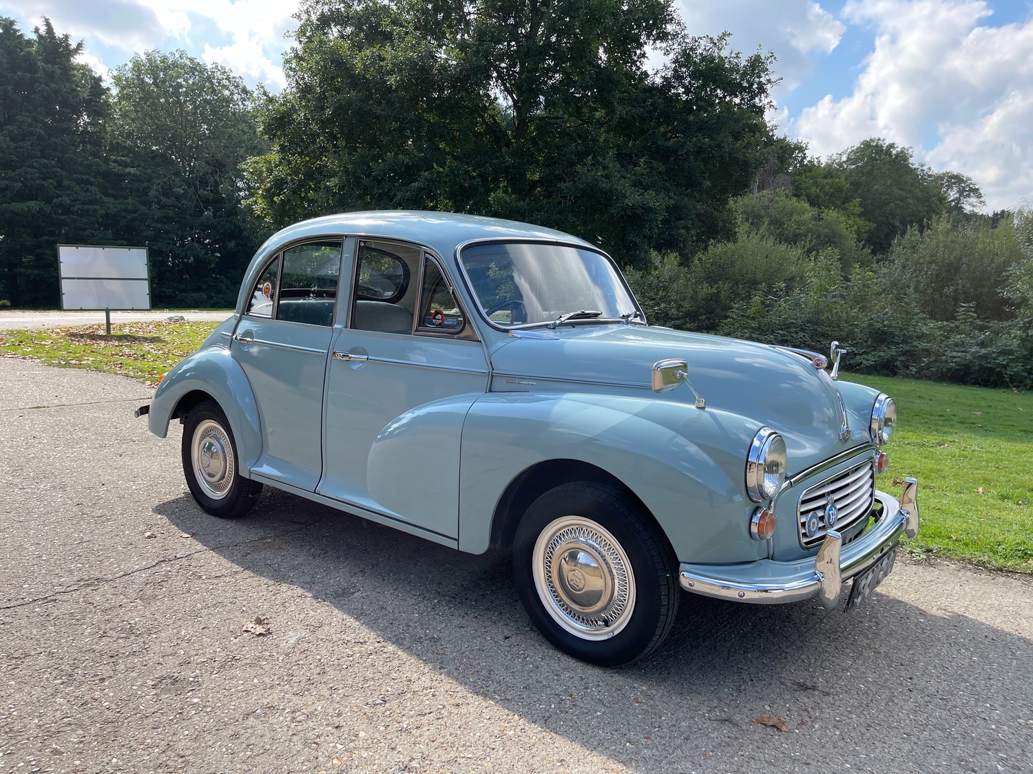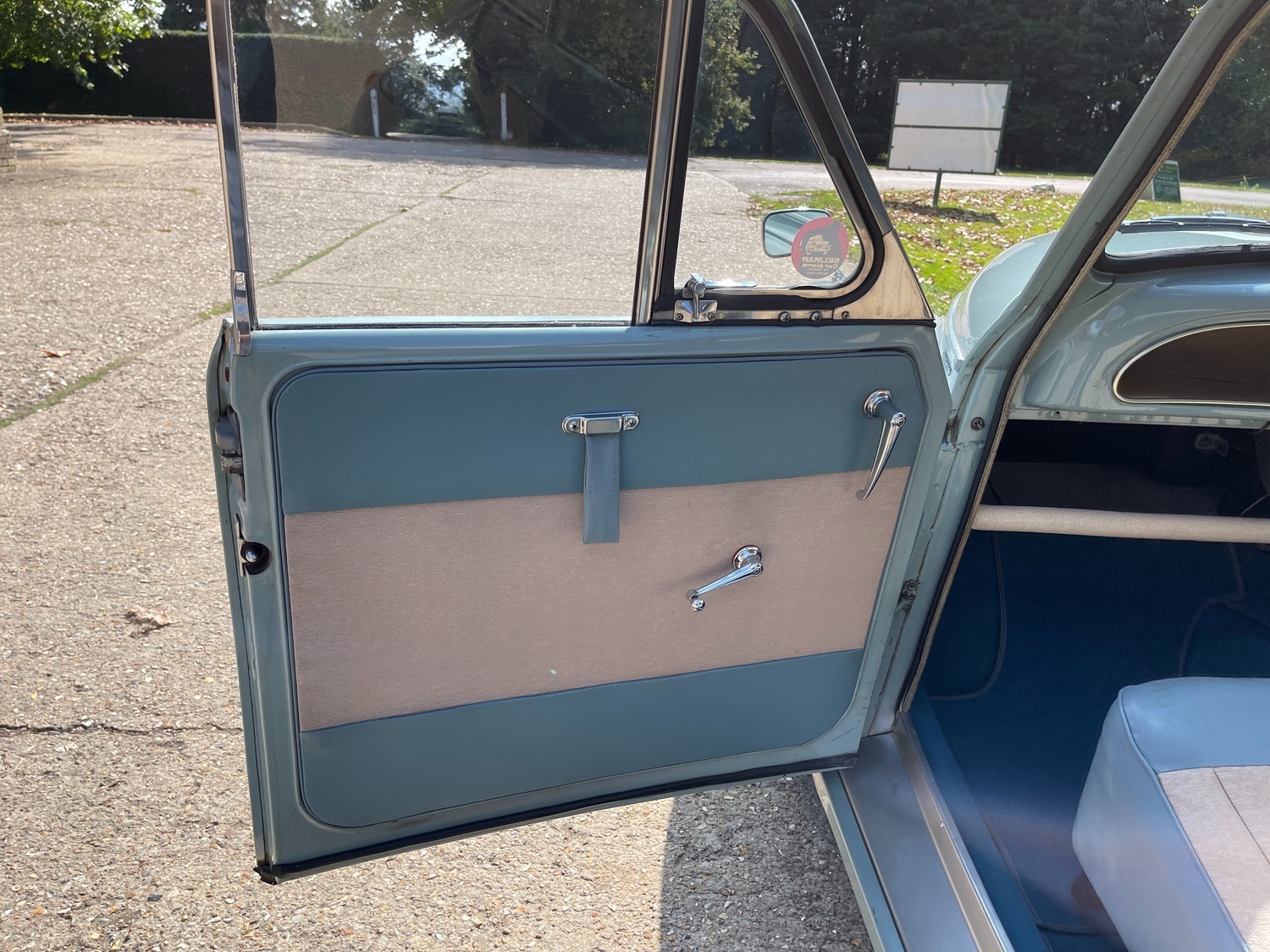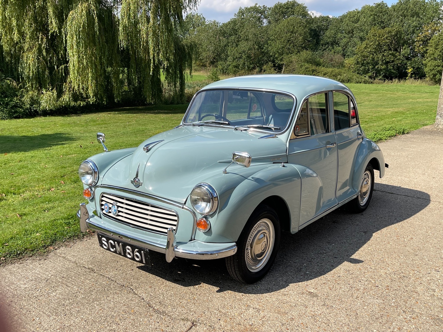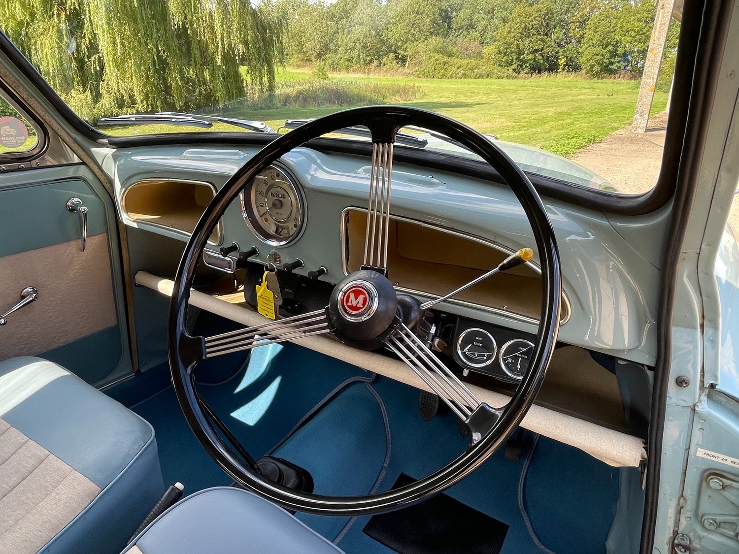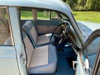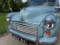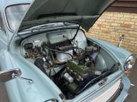 In stock with us here at RFH Classics we have this 1964 Morris Minor 1000 4 Dr finished in Smoke Grey. The car is just a 2 Owner from new which I think we can all agree is quite an unusual find. The car has been the subject to light restorative work over the years and is in exceptional condition. The car was originally supplied by W Watson & Co in Liverpool on the 17th July 1964 for which we have the original buff style log book confirming the car was supplied on the plate still fitted too the vehicle. In June 1993, due to the death of it's first owner the car was advertised for sale in the Greasby Post Office window and was recorded as having just 5,400 miles on the clock, we have in the file a copy of the advert in the window. It was sold to the 2nd owner who kept the vehicle until we recently purchased it, what a lovely little bit of history for this car. Now it appears that the 2nd owner subsequently has used the vehicle on a regular basis but it certainly seems as though we can confirm the mileage to be correct supported by extensive documentation in the massive history file we have for the car. Within that history file in the office we have a report done in June 1996 detailing that the car had done at the time less than 10,000 miles and that the car had been Finnegans Wax oiled from new in order to preserve this lovely example. In there are massive amount of old MOT's dating back to 1967. The interior of the car is in exceptional condition fitted with the original Two Tone Blue & Grey seat trim and the car drives very well. For sure this car is going to being a great car for the 3rd owner to continue its ownership and maintain its impeccable history.