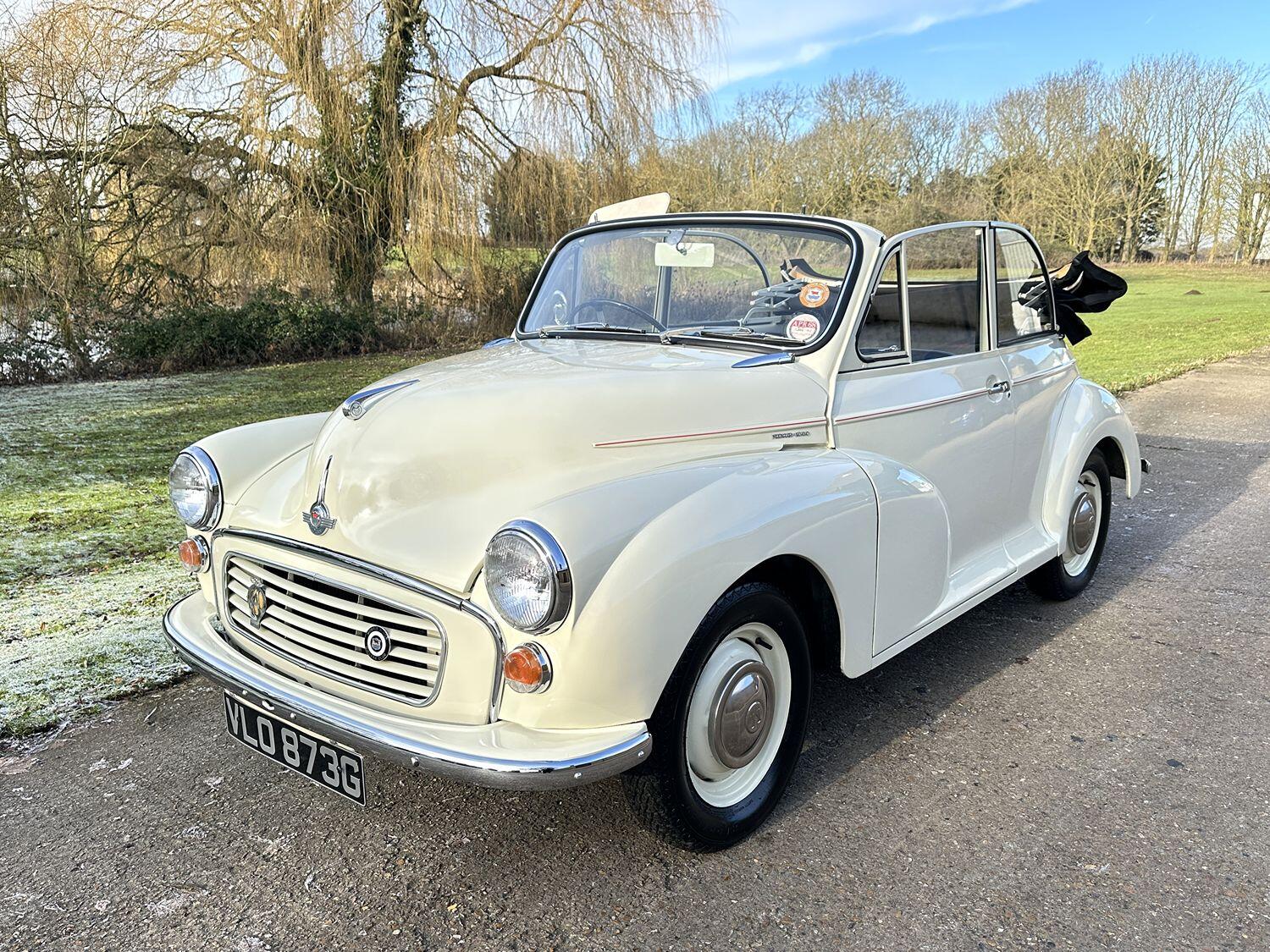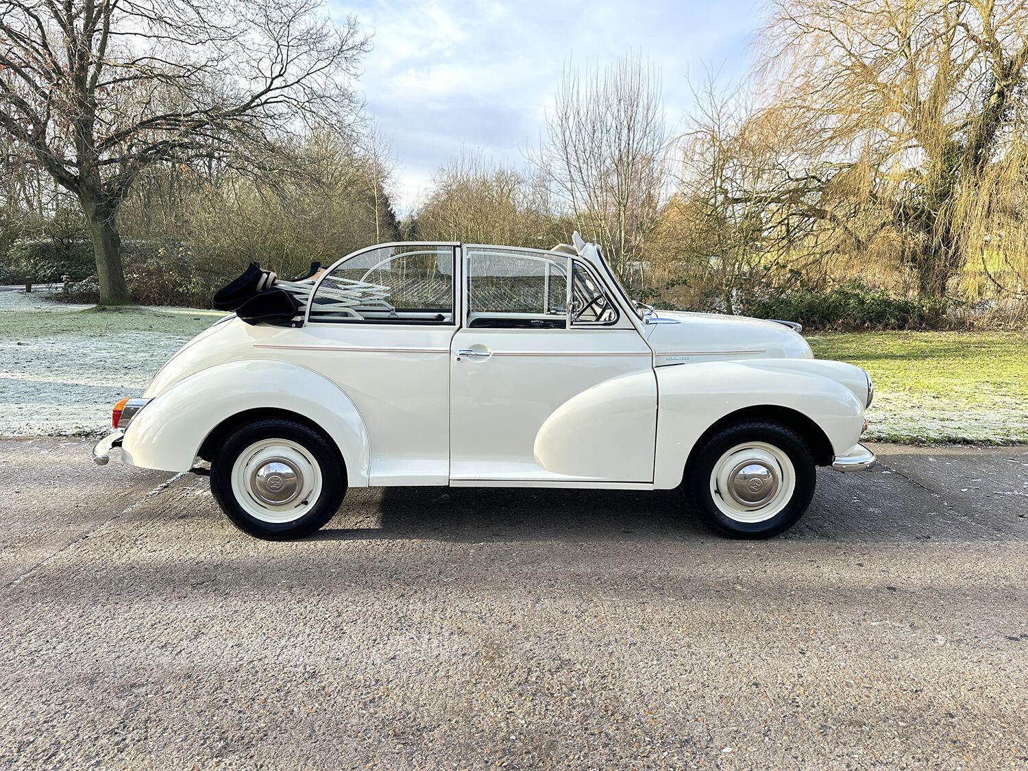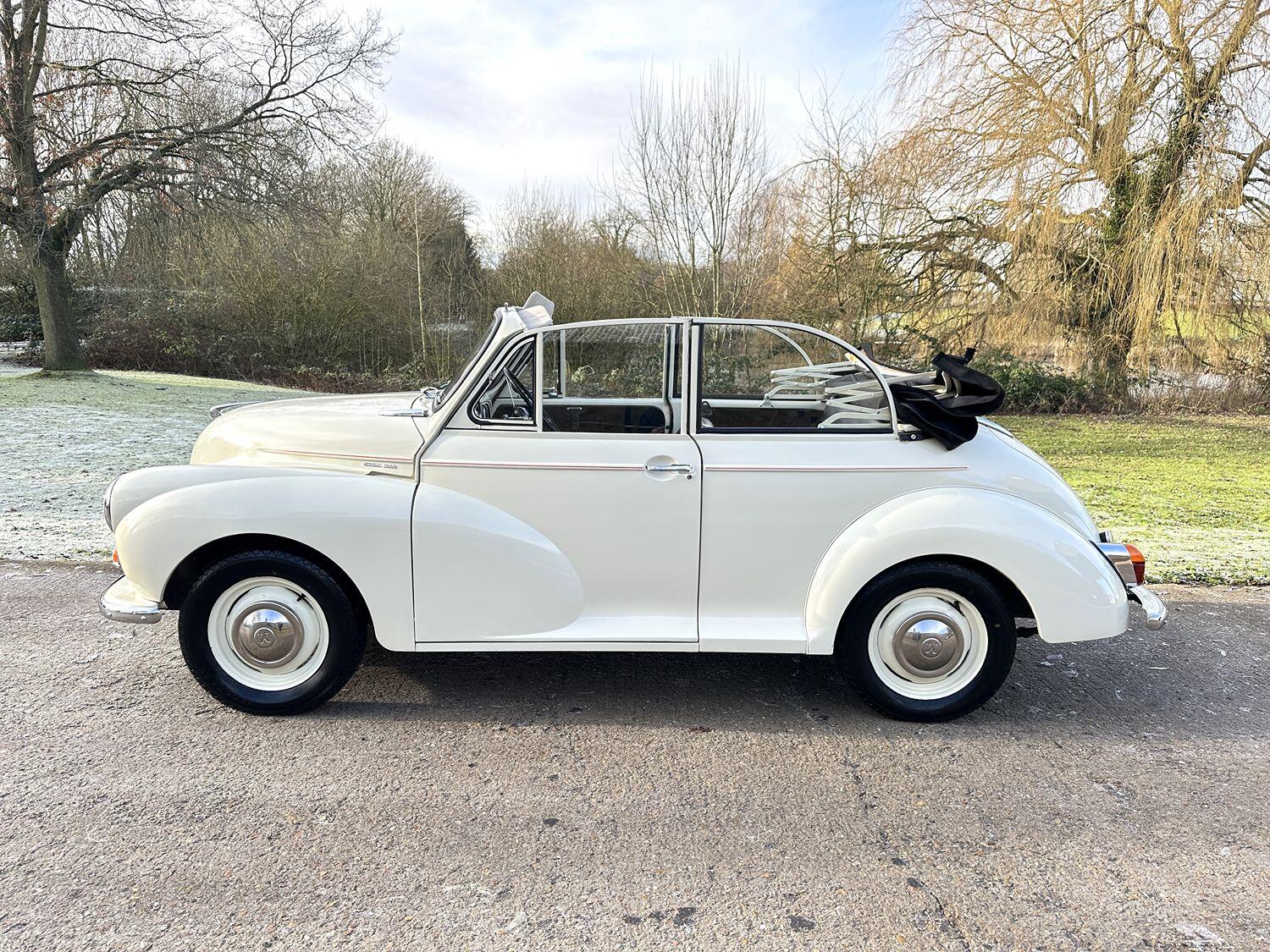 Now with us here at RFH Classics we have this 1968 Morris Minor 1098cc Convertible, or often referred to as a Tourer. Finished in the very period colour of Snowberry White the car has a contrasting Black interior and is enhanced further with the recently fitted Mohair roof that is in excellent condition. We will have to follow the Mohair cover for the roof when folded. This genuine Morris Tourer, complete with the correct factory strengtheners is in excellent order and has undergone an extensive program of restoration and refurbishment. The bodywork is in superb condition with excellent paintwork and very good panel gaps. While the drivers door alignment could be slightly improved, it is a minor point that will be addressed prior to sale but is not something that detracts from the overall condition.