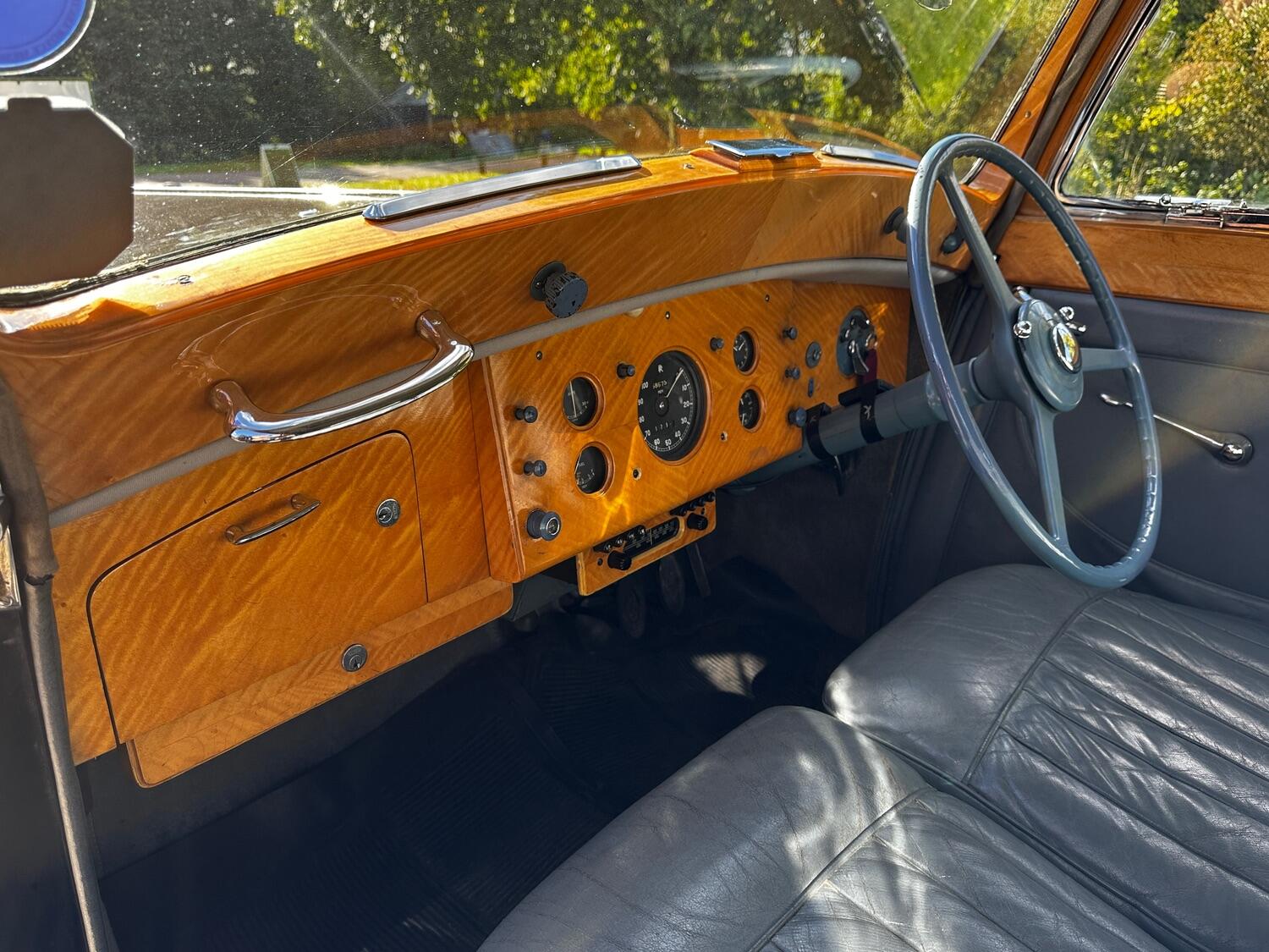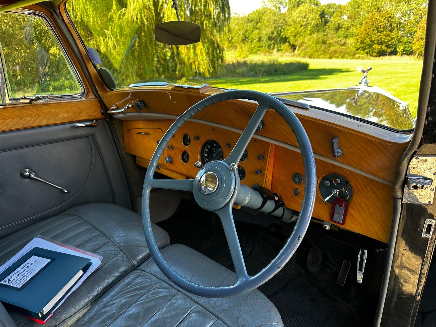 Now this is not a car without the expected age related patina but in our opinion this just adds to the charm and character of this stunning car. A walk around the car highlights the stunning lines that Rippon originally designed into the car. When you open either door you are greeted by chrome plaques in either doorway that confirm who built this beautifully crafted car and it exudes the warmth of leather and varnish. The quality of the build shows through today. Here we have a seventy four year old wonderful car that is complete today with original stunning wood marquetry, Bakelite switches, deep woollen carpets, top grade leathers and hand painted coach lines. They are brought together here with this Silver Wraith and it has created what can only be described as a piece of history.